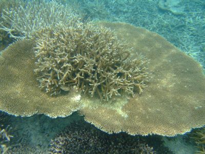 テーブル珊瑚の中央に、エダ珊瑚があったり~面白いw