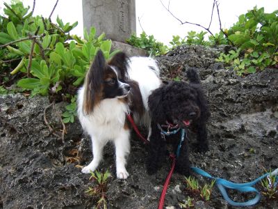 そして、夜のお散歩では、そらとモカに、シーサーモドキになってもらいました。