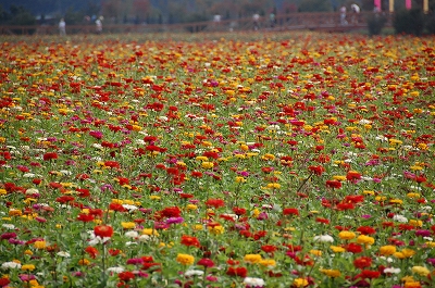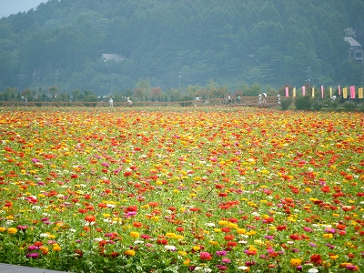 そのまま車を走らせると、ありえないほど大量の、色とりどりの百日草のお花畑!!
