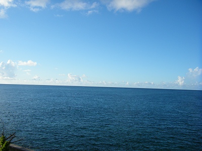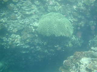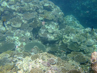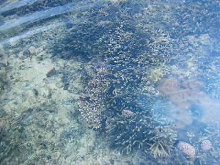 リーフの岩の上に立って、海を見ると、サンゴやお魚が見えます。