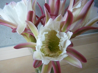 ドラゴンフルーツの花を小さくした感じです^^