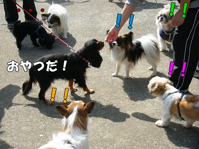 いろんな飼い主さんがいろんなおやつを持っていて、あっちこっちでおやつを貰ってます。