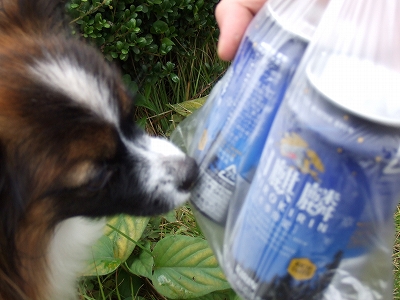 お墓にお供えするビールの周りの水滴で水分補給中のそらくん・・・。