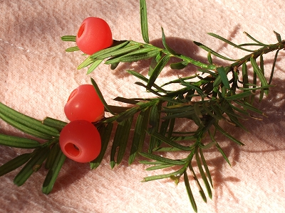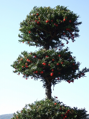 赤い実を付けたクリスマスツリーのような木です。