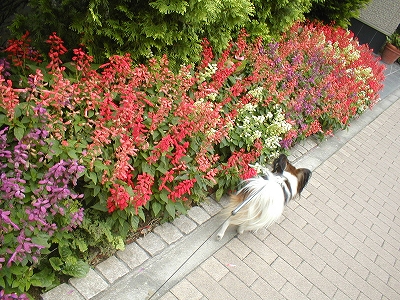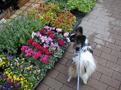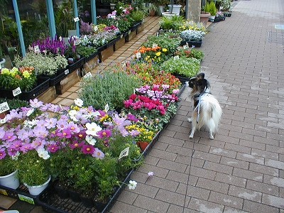 お花屋さんの前を通ると、色とりどりのお花に、そらもクンクン!