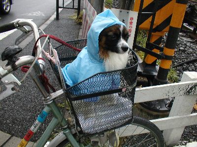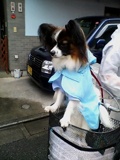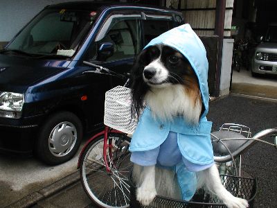 そら君洋服きて、レインコート着て、自転車のカゴへ。