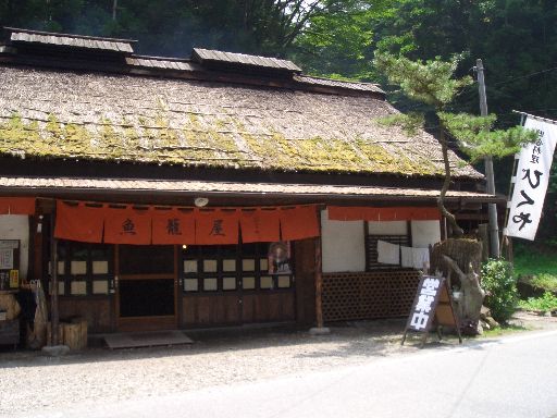 このお店は、郷土料理と、岩魚料理のお店で、古風な茅葺の建物、店内には、囲炉裏や、小さな渓流で生きた岩魚・カジカなどが泳いでいます。中央の大きな囲炉裏では、岩魚の塩焼きやみそ焼き焼いています。