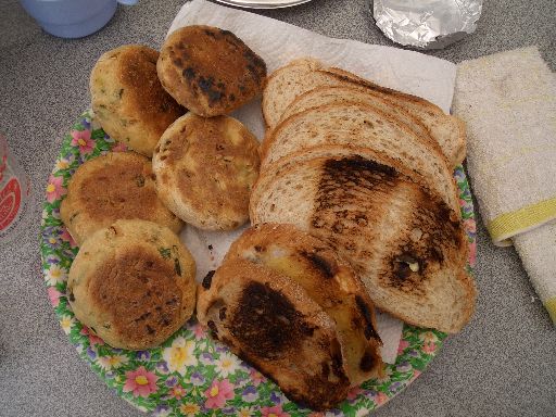 左の5つは、来る途中に昼食を食べた「びくや」さんで買った、お焼きですが、右の手前2枚はくるみレーズンパン。