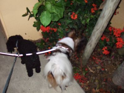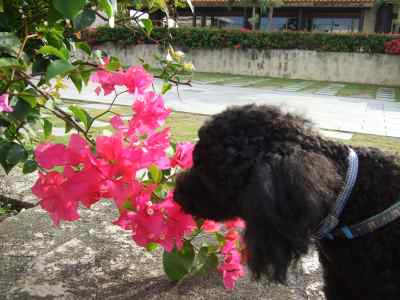 マンションの敷地内にあるお花をクンクンする、そら&モカ♪