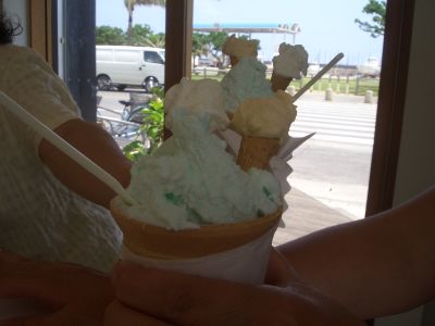 右が私が頼んだものです。「もずく」味のジェラートは、ある意味、挑戦でした。