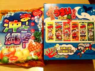 左側は、この間の、パナリ島ツアーの時に、船でもらった飴がおいしくて、たまたま売っているのを発見したので即、購入した、オキナワキャンディー♪こちらも、沖縄テイストな味ばかり♪