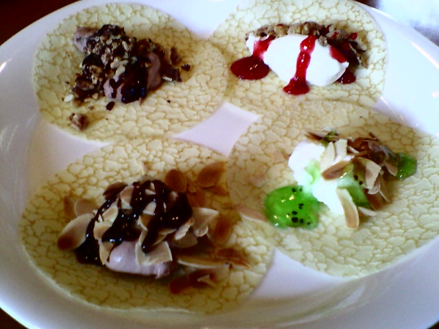 大皿にクレープの皮を4枚取って、好きな具を取ってラズベリーやキウイなどのソースをかけて、席に戻って巻いて食べる(^~^)モグモグ