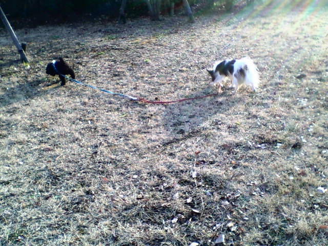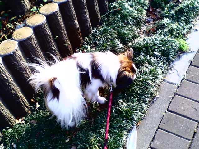 分かる人は分かるこの場所、ちょっと生垣の間から、広いスペースでリードをつけたまま自由にしてあげていると・・・。