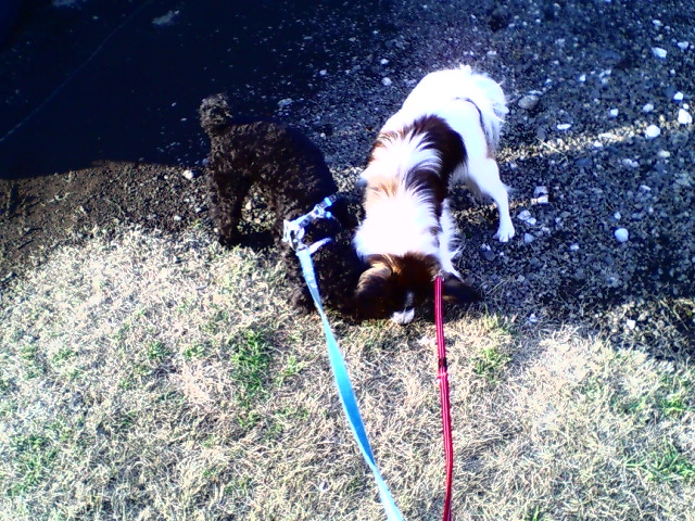 そらとモカ一緒にお散歩していると、気になる場所は一緒のようで、同じ場所に鼻を押し付けてクンクンしていました。