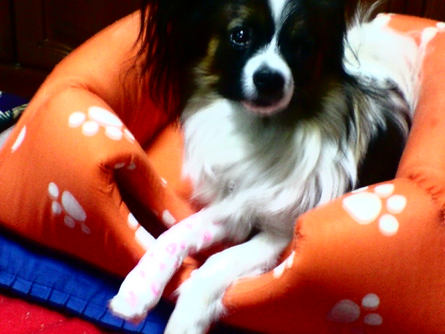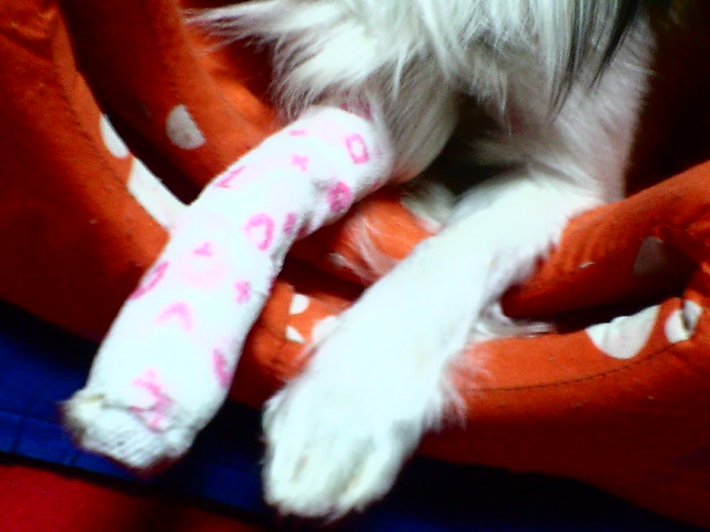 私の所見によると、兄の靴下に狼爪が引っかかり、慌てて手を引いたので、硬い爪が折れて、中の神経までは傷ついていないだろう!と考え、まだ、完璧に折れてはいないから、とにかくあまり動かせないようにして、